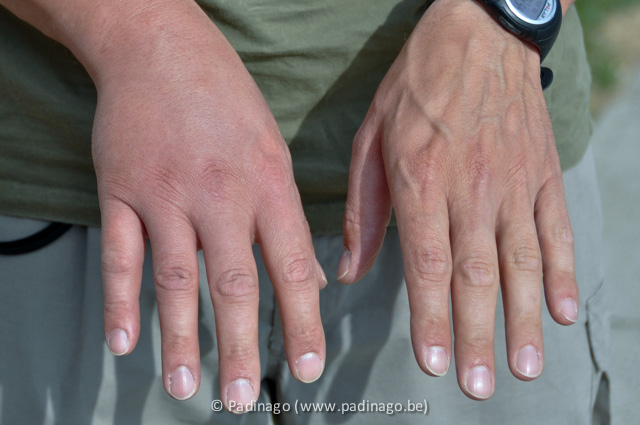 An hour later, just passed Canim and Mahood Falls, we arrive at Mahood Lake where we have lunch. Then we continue and park our car on the parking. Before walking to the waterfalls we check if we have all our stuff in order to cover as much skin as possible because of the mosquitos. We took a picture of us and we just look like a gang planning to rob a stagecoach. First we see the Mahood Falls and then we walk to the Canim Falls. They are beautiful but as expected it is full of mosquitos. Again, while taking pictures our hands and camera’s are covered by them! Only Lucien seems not to have too much problems with them. We drive back and take the road passing next to Canim Lake. On our way, across the bridge over Buffalo Creek we see a very nice horse. Maybe it escaped from his meadow… A bit later we arrive in 108 Mile Ranch and check in at the 108 Mile Resort. We suddenly notice that Patrick has an allergic reaction to some kind of mosquito bite as his hand is swollen. We decide to go to the local supermarket to find some products. The people at the 108 Mile Supermarket are so nice and helpful and within 5 minutes customers and personnel of the store are helping to find some product or medication for us. As they do not have the necessary medication they advice us to drive to 100 Mile Post as they have a Pharmacy over there. Finally we get some strong medication (antihistamine, allergy formula 25mg) but they advice us to go to the hospital in 100 Mile House. Patrick needs to take 2 pills already and feels immediately ‘high’. Nathalie takes over and drives on. She will drive for the next two days until Patrick is feeling better and can stop with the medication. We follow the advice from the pharmacist and our GPS brings us straight to the hospital. There the first question we get is: “where are you from?” As we are foreigners we have to pay 680 CAD in advance before getting to see a doctor. By coincidence there is a doctor at the reception desk who just finished working at the walk-in clinic just around the corner. She has a quick look at Patrick’s hand and for free. She tells us he will survive and has to take his medication for 3 days. If it is not better tomorrow morning we have to come to her at the walk-in clinic where it would only cost 65 CAD and she would then help us. It was probably a bite of a black fly, a “no-see” as they call it because it is so small (about 3mm). We are reassured and drive back to the hotel. It is a nice hotel with a huge domain and golf field around it, which they were still working on to finish it. We decide to go to the golf club at the hotel for dinner and we really are ‘in the middle of nowhere’. After dinner we have a drink at the bar before going to bed. We start talking with 3 fire fighters and they tell us about the fires we saw on our way. It were very nice guys and they also told us that there are fires around here, some of them might even have been started by tourists.