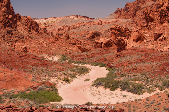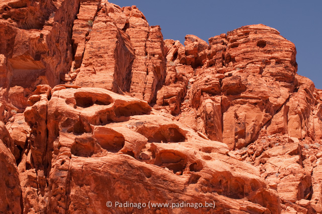 Finally it was better than expected but because of the bumpy road we really need to look for a nearby tank station in order to find the restrooms... Afterwards we continue to the “Valley of Fire State Park”. Around 1.15pm we arrive at the entrance of the park where we see a “self pay booth”. Here we have to put our dollars in an envelope, tear off the slip and put it in the car and drop the envelope in the mailbox. Further on we make our first stop at the "petrified log” (a petrified tree of about 225 million years old) of which we take a picture. Patrick walks up the steep hill and take some pictures of what is behind the hill. Getting back down is less stylish but faster than foreseen... There is a lot of wind which created this park. We see a picnic area under a huge rock and drive towards it. We have tried to have our lunch there but because of the very strong wind we got more sand in our mouth than food so we decide to continue our lunch in the car.