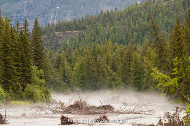 After breakfast we drive to Glacier National Park where we intend to take the Going-To-The-Sun-Route. It starts raining and a bit later we arrive at a roadblock. The road is still closed for traffic (there is still too much snow), it is only open for pedestrians. We park our car and go for a walk. It is beautiful but the nicest part of the road is not reachable for us by foot so we decide to walk a few kilometers and then return and take the car to see another part of the park.