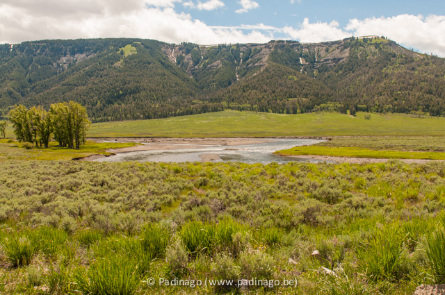 Later on we drive to the Lamar Valley. When we almost reach the plains we see a black bear at the left side of the road. When the bear crosses the road Nathalie suddenly sees a brown bear on the left side. It's swimming across a small pond and then makes a short run. Meanwhile we hear that about 100m further on, a grizzly has been spotted. We just see him disappear in the woods.