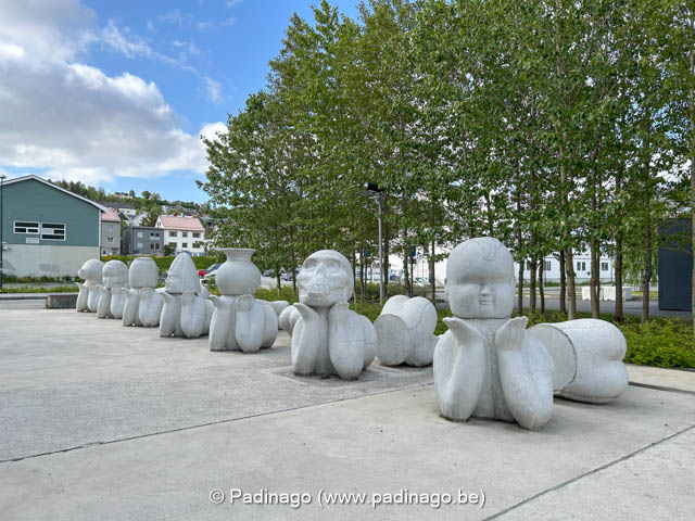 'De Syv Musene' (The Seven Muses) is a series of seven large white concrete sculptures in front of Hålogaland Teater. Inspired by the classical muses, they symbolize creativity and artistic inspiration, each with a unique, mask-like face