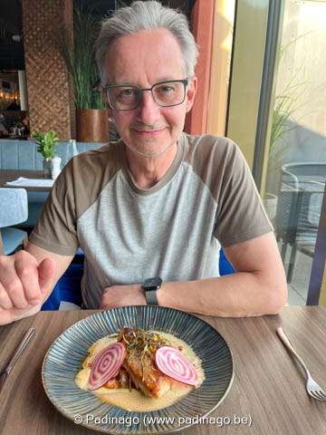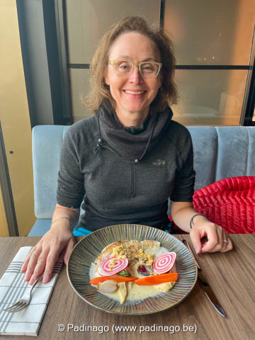 As starter we both take the grilled scallopes and as main Patrick the pan fried redfish and Nathalie the coal grilled turbot